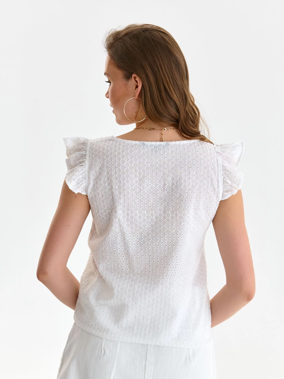 Памучна блуза с къс ръкав с волани и връзка